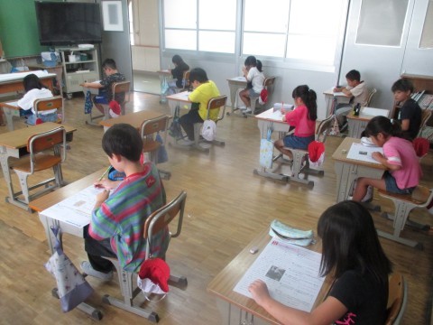 国語のテストをしていました。「どうぶつ園のじゅうい」の読み取りです。説明文をよく読んで問題に答えていました。