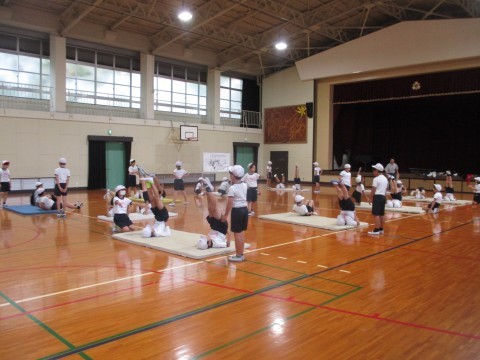 体育では,背倒立の練習をしていました。手で腰を支えて脚をぴんと伸ばします。先生の手本を見た後,自分たちでもやってみました。