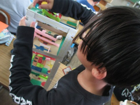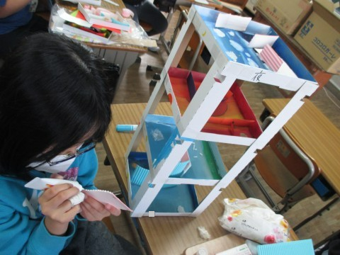 図工で「コロコロガーレ」の制作の続きをしていました。四層に組み立てて,立体的な作品に仕上がります。