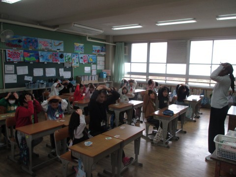 ネイティブスピーカーの先生と,英語の学習をしていました。orange,blue,redなど,色のカードを取り合うゲームを楽しみました。