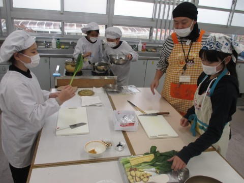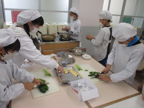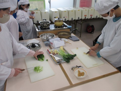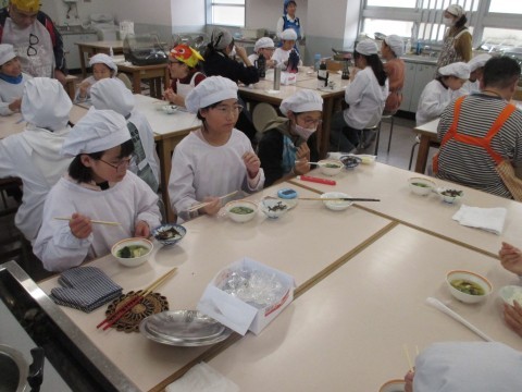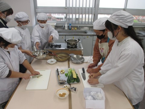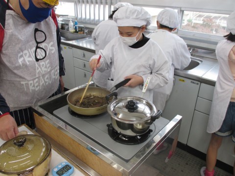 調理実習を行いました。メニューは,ごはんとみそ汁です。だしを取り材料を切って,みそ汁を炊きました。だしを取った煮干しと昆布は,甘辛炒めにしてごはんと一緒に食べます。「いただきます。」のあと,「おいしい!」と言いながら食べていました。