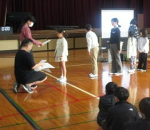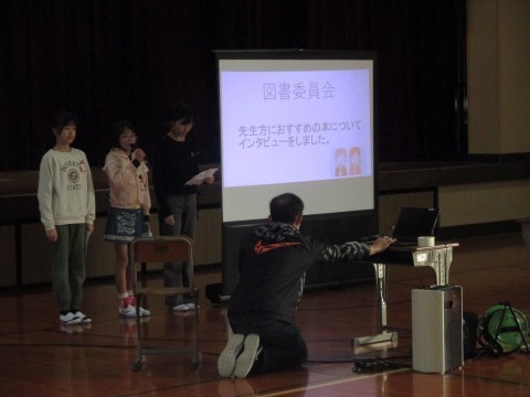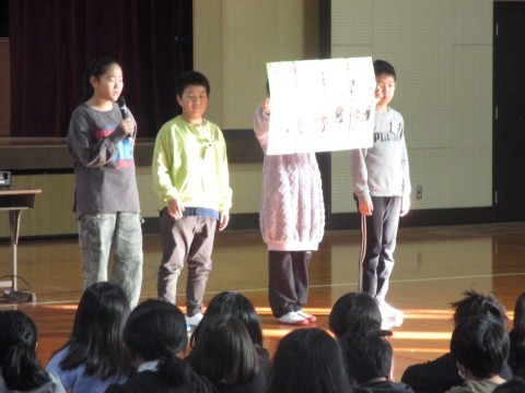 はとぶえコンクールや幼少中美術展,読書感想文コンクールの表彰を行いました。図書委員会からは,おすすめの本の紹介,児童会からは,募金のお知らせがありました。