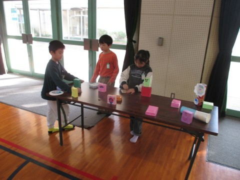 明日のおもちゃランド開催に向けて,体育館で準備をしていました。長机に作ったものを並べると,お店らしくなりました。お客さんが喜んでくれるといいですね。