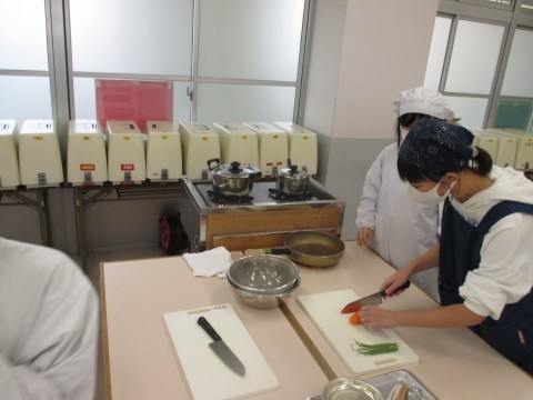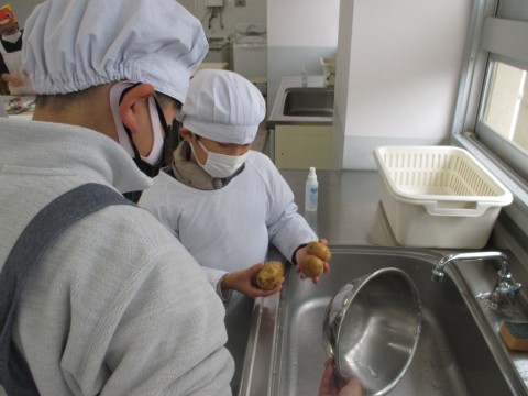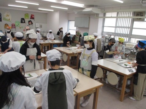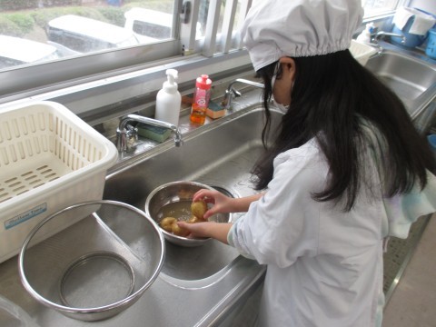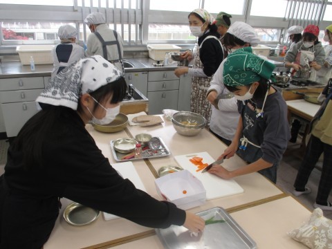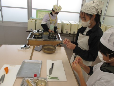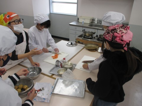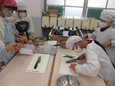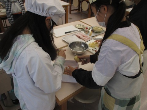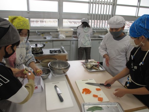 調理実習で,野菜のベーコン巻きとこふき芋を作りました。班で協力して,材料を切ったりゆでたり炒めたりしました。