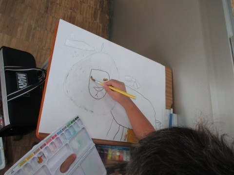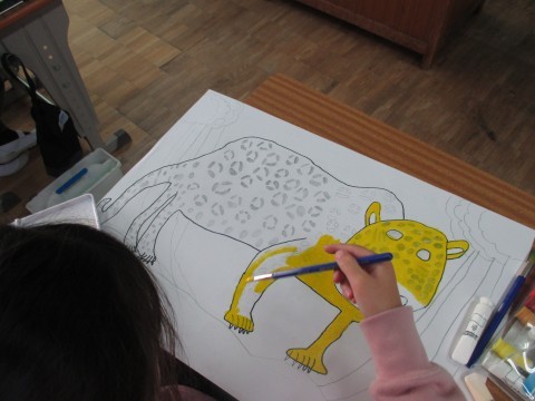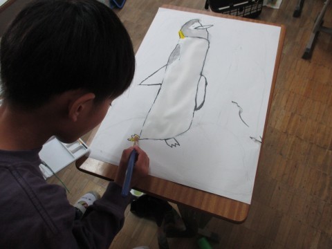 図工では,好きな動物の絵を描いていました。動物園で見てきた姿を思い出して,画用紙いっぱいに描き,絵の具で色を付けていきました。