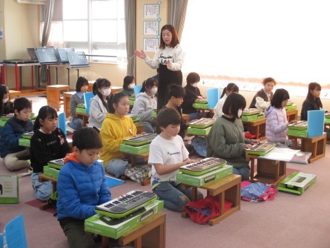 音楽では,みんなでキーボードを弾いていました。「しずかにねむれ」のメロディに合わせて,和音を弾きます。4種類の和音を弾き分けていました。