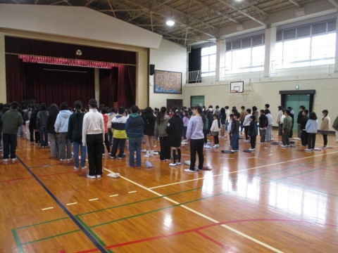 全校朝会を行いました。今朝の体育館はだいぶ冷えていましたが,静かに整列したり話を聞いたりすることができました。