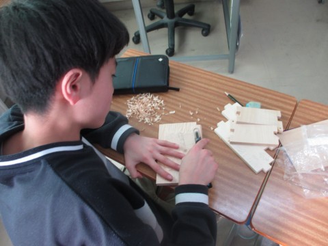 図工では,オルゴールを入れる木箱を作っていました。板に下描きをして,彫刻刀で彫っていきます。できあがりが楽しみですね。