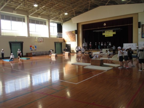 体育では,台上前転をしていました。各コーナーに分かれて,台上前転に必要な動きを練習しました。