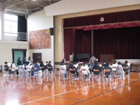 卒業式の練習が始まりました。どのように動いたらよいか,説明を聞いています。