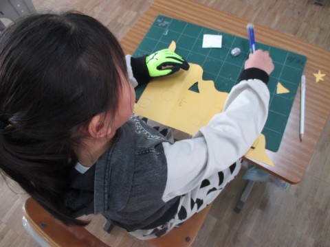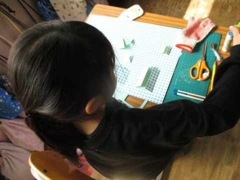 図工では,「まどのある たてもの」の制作をしていました。カッターで切り抜いて窓を開けます。想像を膨らませて色々な形の窓を考えていました。