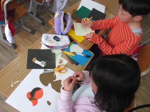 図工では,版画をしました。2年生で楽しかったことなどを,作品に表していました。