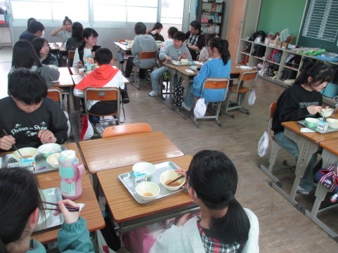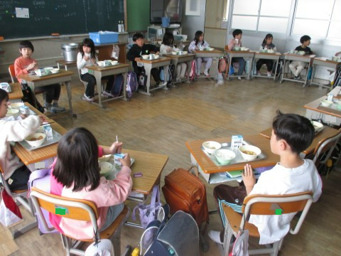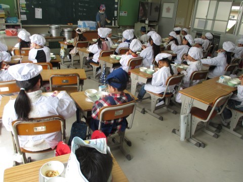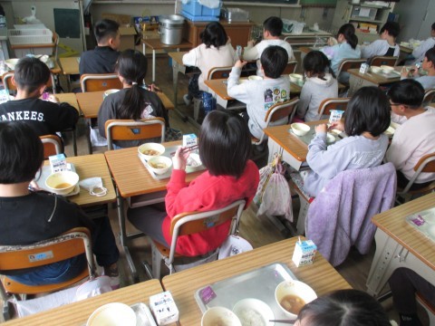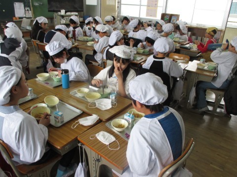 今年度の給食は,今日が最後です。どの学年も,おいしそうに味わって食べていました。順に,1年生,2年生,3年生,4年生,5年生の様子です。