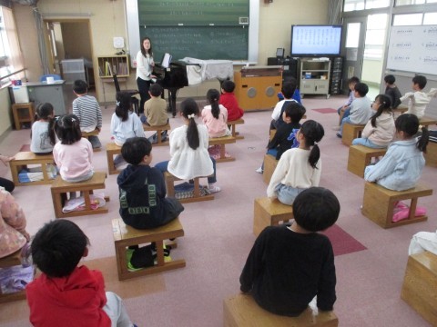 音楽の時間の様子です。校歌の歌詞を見ながら,先生の範唱に続いて歌っていました。