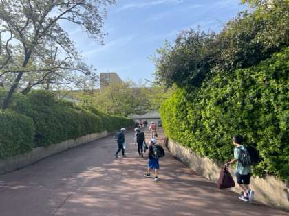 荷物をたくさん持って少し重そうですが、子どもたちは元気に登校しています。