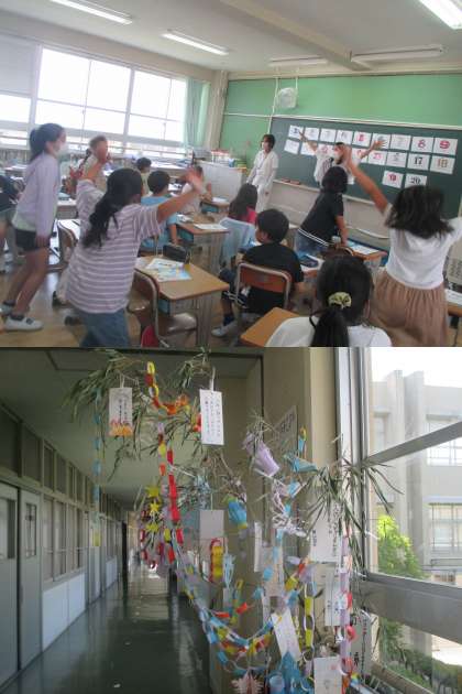 廊下には七夕の笹があり、願いごとが書かれていました。