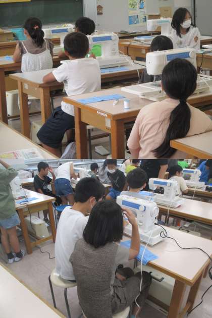 家庭科の授業でミシン縫いにチャレンジする5年生です。