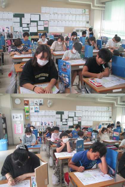 外国語のテスト「My Summer Vavation」に真剣な態度でチャレンジしている6年生の子どもたちです。
