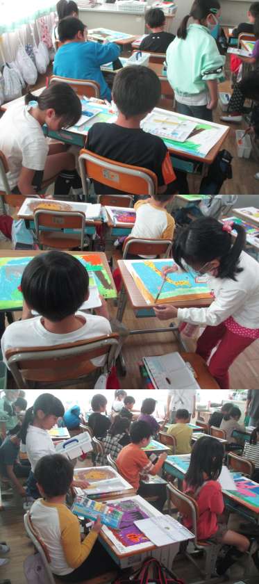 校外学習(天王寺動物園)を思い出し、動物を描いています。みんな、縁からはみ出すほどの迫力がありとても上手でしたよ。