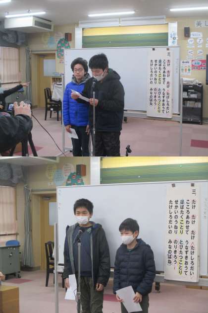 今日の全校朝会は校長先生のお話の後、保健安全委員会と生活環境委員会から連絡とお話がありました。また前回に引き続き、図書委員会からは絵本の読み聞かせがありました。上手に伝えることができました。