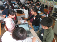 NSの先生の発音を真似して、学校の施設を英語で発音していました。