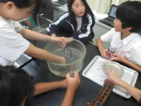 理科室で実験をしていました。今日は、炭酸水には何が溶けているかを調べます。班で協...
