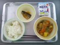 今日の献立は、ご飯、牛乳、肉じゃが、さわらのこうみソースです。「さわら」は、漢字...