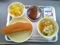 今日の献立はご飯、味噌汁、牛乳、野菜炒め、いわしフライです。