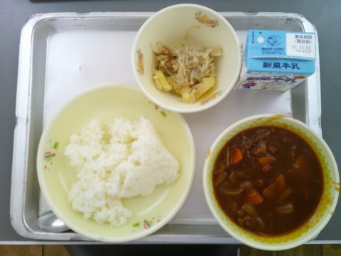 今日の献立は、ご飯、牛乳、ハヤシライス、えのきベーコンです。