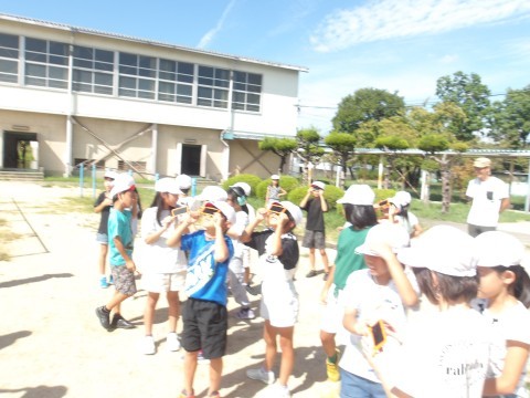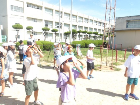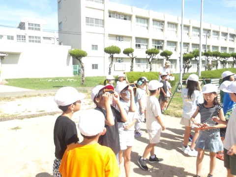 遮光板を使って太陽の位置とかげの関係を調べました。理科の実験や観察は楽しいですね。みんな興味深々でした。