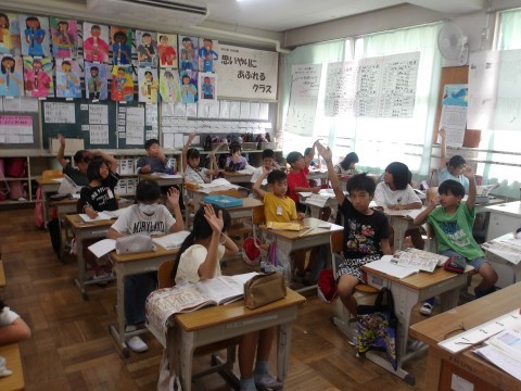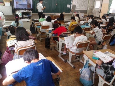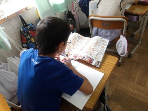 スーパーマーケットの工夫について考えました。食料品売り場の地図を見たり、おうちの人と買い物に行ったことを思い出しながら、ノートに意見を書いていました。