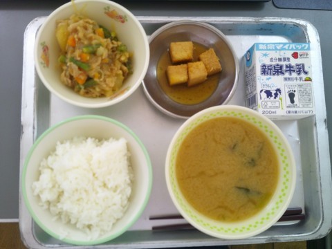 今日の献立は、ご飯、牛乳、厚揚げの生姜焼き、ごもく汁です。