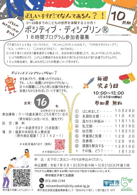 令和7年度 前向き子育て ポジティブ・ディシプリン プログラム(10月期) 参加者募集【要予約】「堺市南区政策会議連携事業」