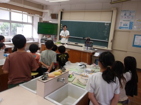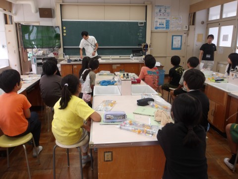 「空気を押すと水がどれくらい飛び出るか」という実験の結果をみんなで予想し、先生が実験する様子を観察しました。みんな興味深々でした。