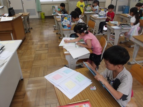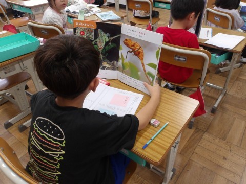 説明文「うみのかくれんぼ」でいろいろな動物のかくれ方について学んだ後、他の生き物のかくれ方について調べています。