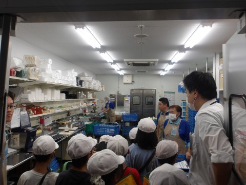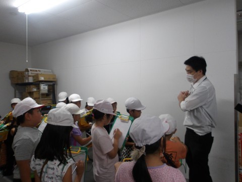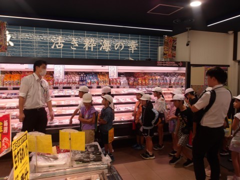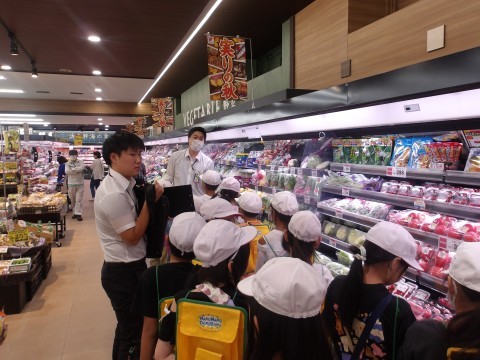 スーパーマーケットの見学に「万代」に行きました。店内を見学後、店長さんにたくさん質問しました。1日に来店するお客さんの数が、多い時は3000人を超えると聞いて、とても驚いていました。