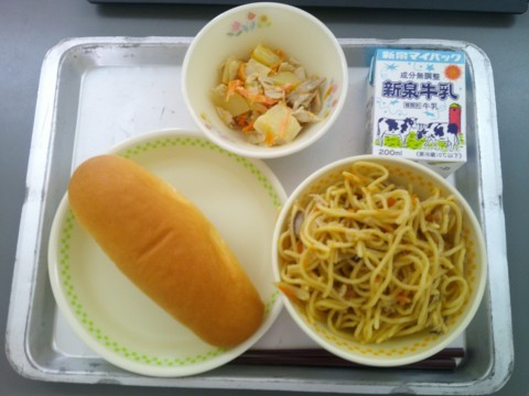 今日の献立は、ミニコッペパン、牛乳、きのこスパゲティ、ポテトサラダです。