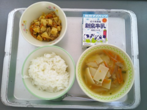 今日の献立は、ご飯、牛乳、麻婆豆腐、ワンタンです。