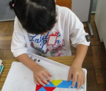直角三角形の色板を敷き詰めながら、模様を作っています。