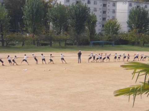 綱引きが1チームしかなく練習の仕方で困っていたところ、5年生が練習相手として来てくれました。