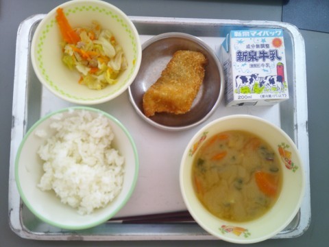 今日の献立は、ご飯、牛乳、さつま汁、キャベツの炒め物、白身魚フライです。