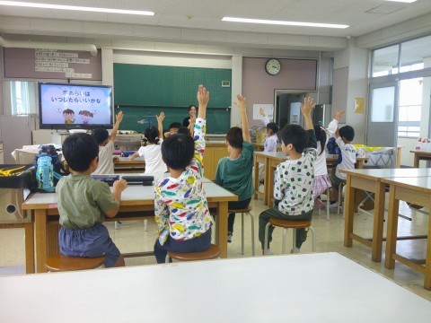 保健の先生による手洗いの指導がありました。みんな積極的に手をあげて授業に取り組んでいました。