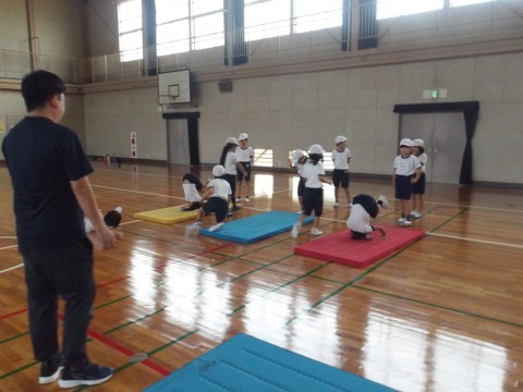 体育館でマット運動をしていました。何度も勢いよく,前回りの練習を頑張っていました。