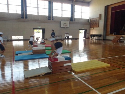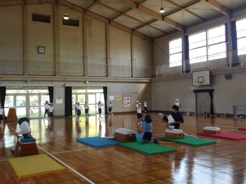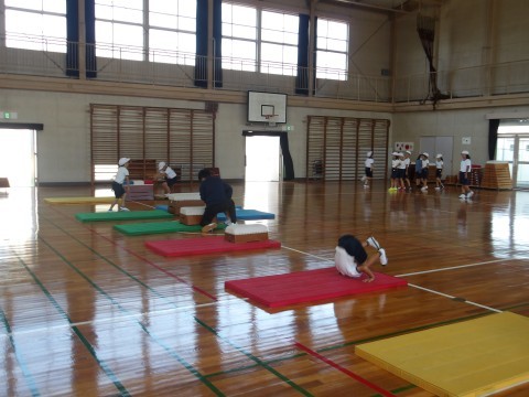 台上前転の練習をしました。マットのみ→1段→2段→3段といろいろな場が設定してあり,子どもたちは自分で選んだ場所で挑戦していました。