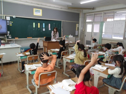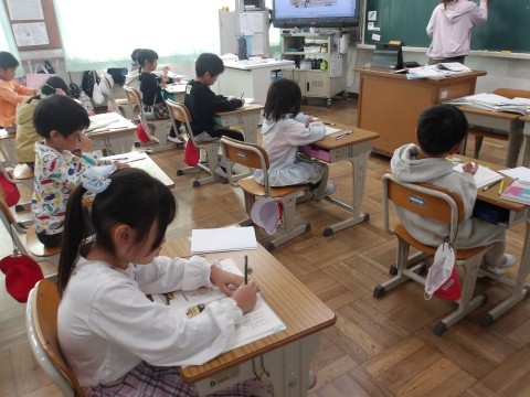 説明文「じどう車くらべ」を読み深めています。トラックの仕事は青色で,つくりは黄色と緑色で,教科書から探して線を引いていました。