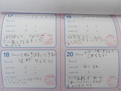 本を読んだ後,読み聞かせを聞いた後は必ず読書ノートに感想を記録しています。上手に書けるようになってきました。