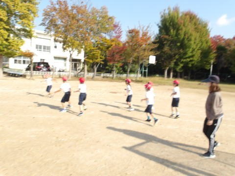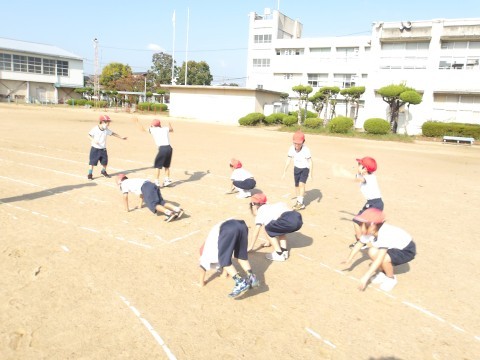 運動場いっぱいを使って,サーキットトレーニングに楽しく取り組みました。