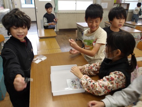 じしゃく同士をくっつけたり,じしゃくにクリップをたくさんつけたりして,じしゃくの力を確かめていました。