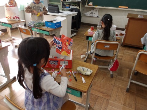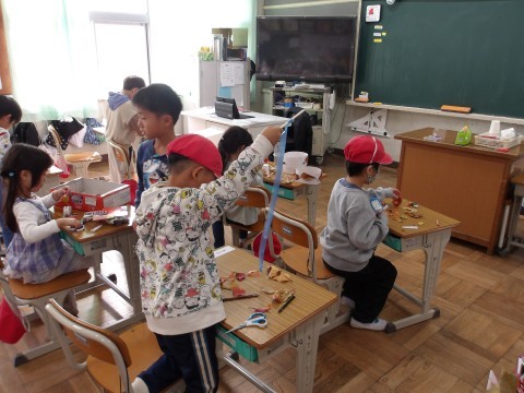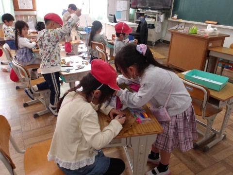落ち葉やどんぐりなどを使っておもちゃを作っています。めいろやつりゲームなど,工夫してつくっていました。