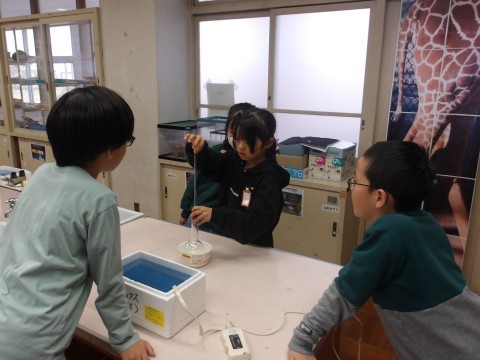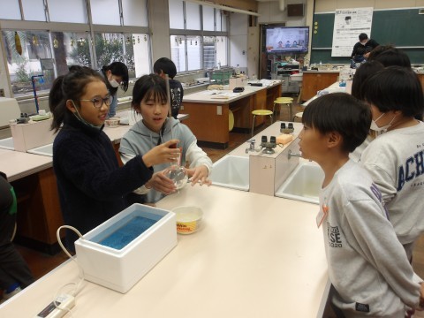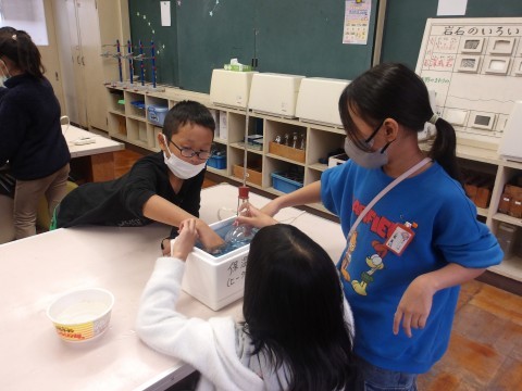 空気を温めたり冷やしするとどうなるか,実験をして確かめました。ガラス管にはさんだゼリーが上下するので,とても驚いていました。